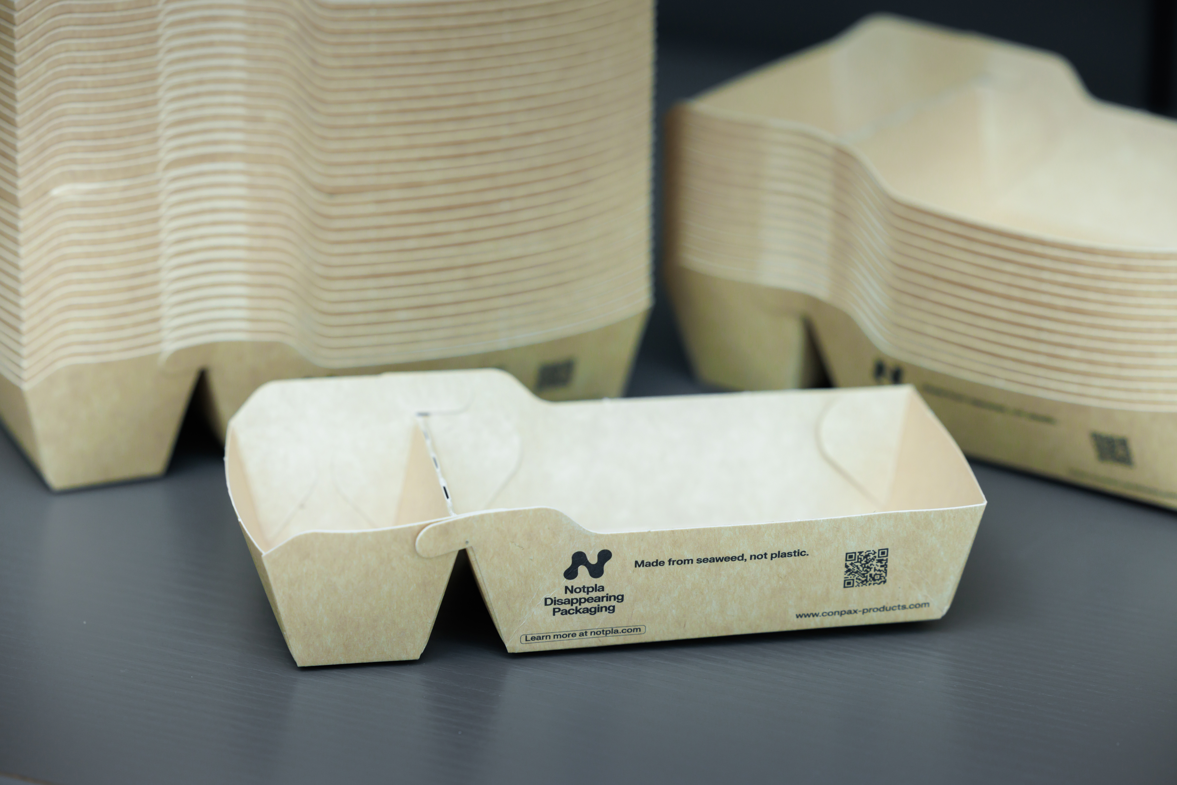 Friet- en snackbakjes gemaakt van zeewier? Eigenlijk heel logisch. Deze NOTPLA-bakjes produceren 39% minder CO2-uitstoot in de productie vergeleken met een bio plastic bakje. Klein verschil, grote impact.