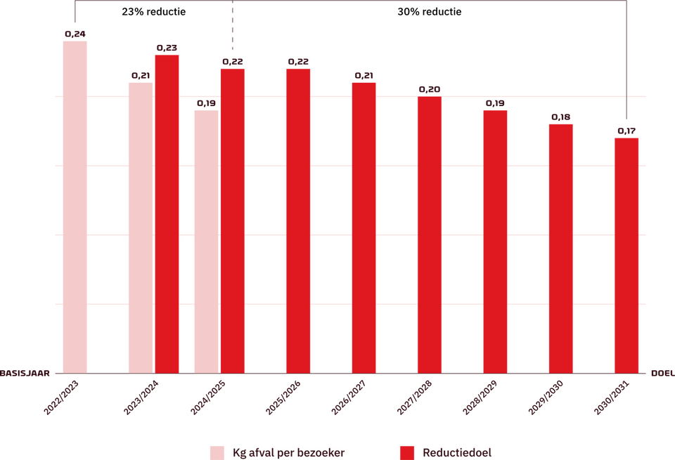 Minder afval, meer impact! Met 0,187 kg per bezoeker in 2024/2025 hebben we al 23% gereduceerd. Om ons doel te behalen moeten we kritischer zijn op hoe we zelf inkopen en welke materialen andere partijen ons pand binnen brengen.