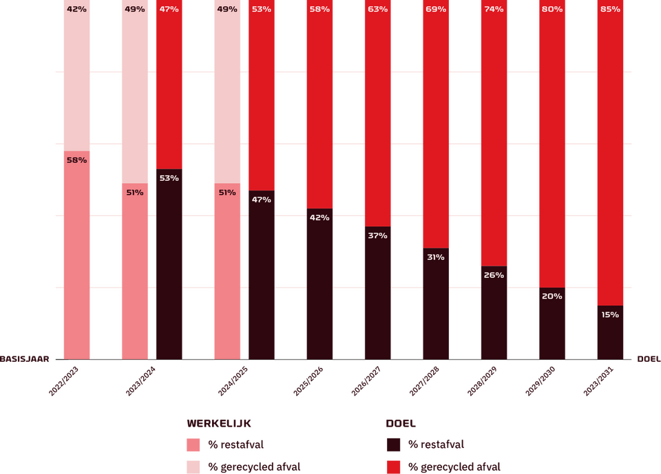 Bijna de helft daarvan is restafval. Ofwel afval dat niet meer gerecycled kan worden en dus de verbrandingsoven in gaat. Dat doet pijn, want onze droom is om restafval in ons stadion op nul te krijgen. Alles kan een tweede, derde of zelfs tiende leven krijgen. Daarom bouwen we aan een stadion zonder restafval en zetten we hergebruik in de spotlight.