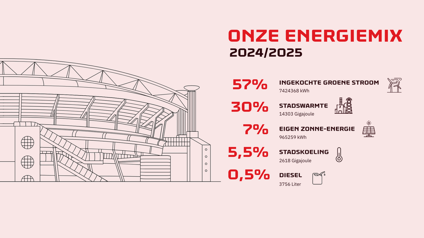 We zijn van het gas af voor de verwarming van het stadion, maar nog niet helemaal van fossiel af. Dat komt doordat een deel van de stadswarmte die we gebruiken helaas nog steeds afkomstig is uit gascentrales. Samen met onze leverancier Vattenfall werken we eraan dat voor 2040 ook die laatste fossiele druppel uit ons systeem verdwijnt.